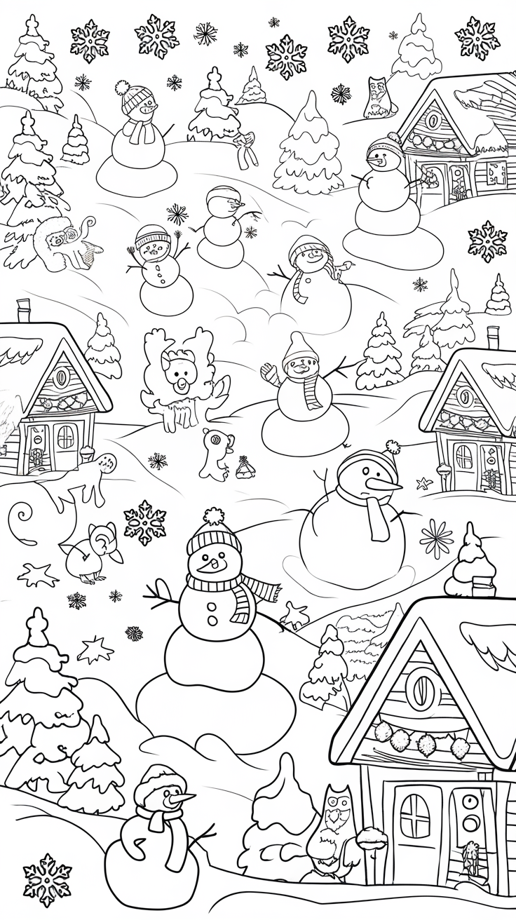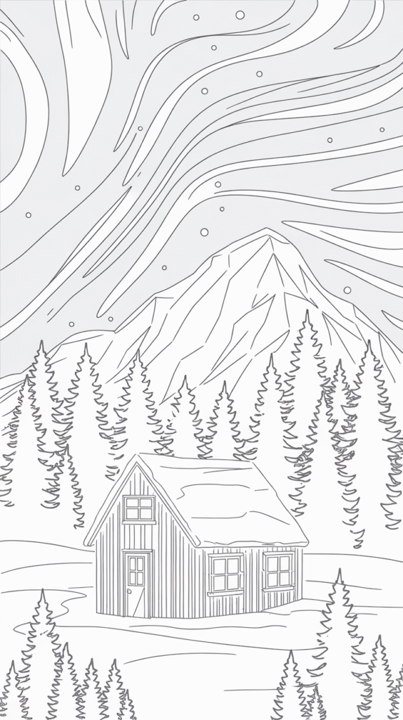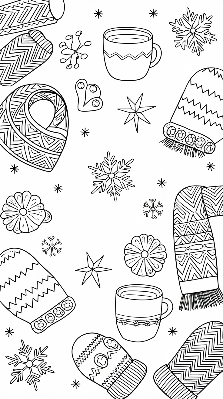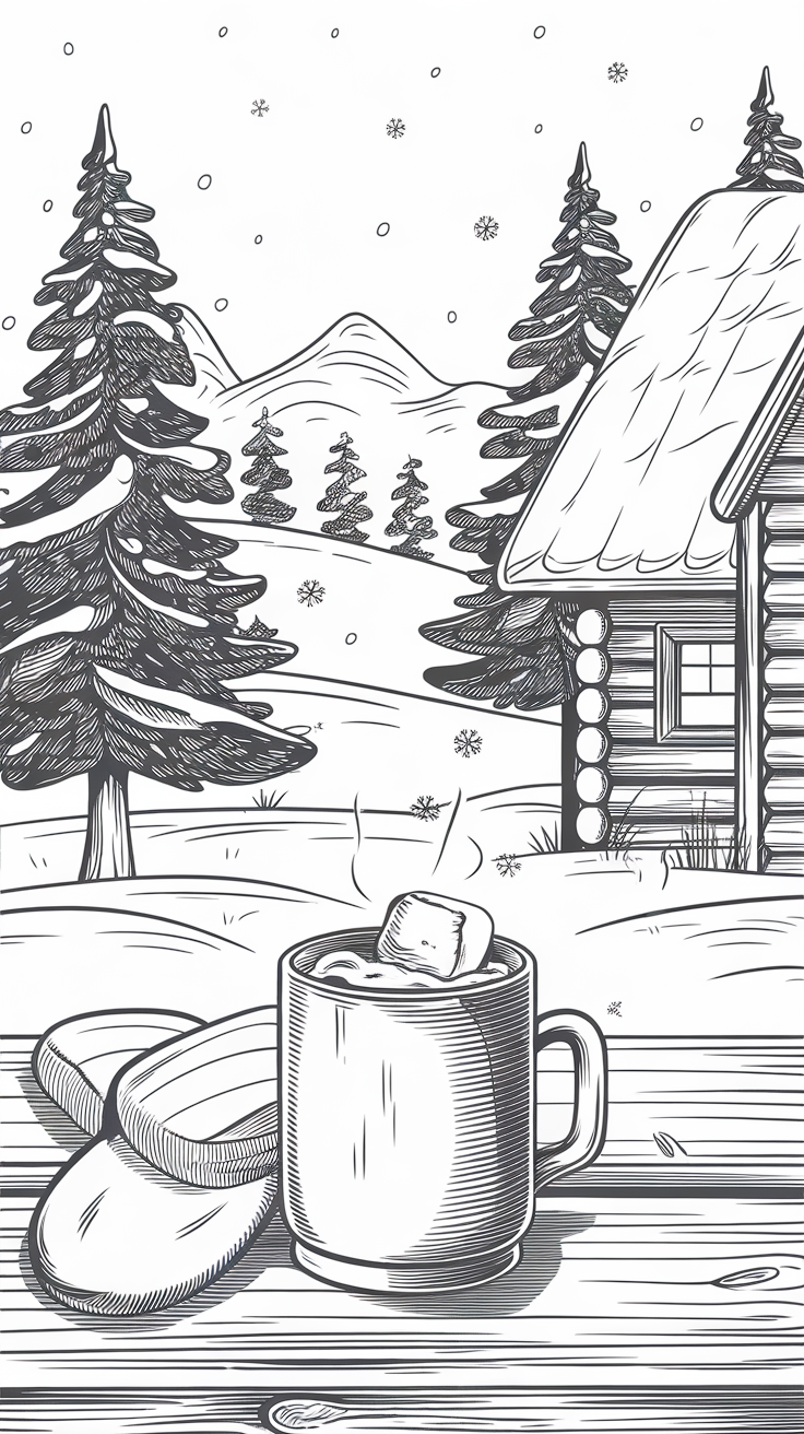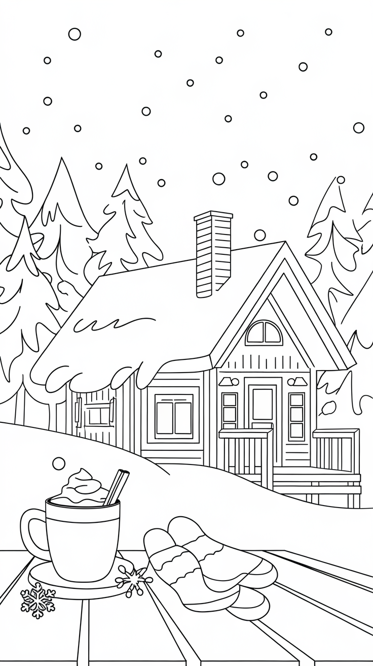 Adults love relaxing coloring pages too! Try intricate mandala snowflakes, cozy cabin scenes, or aesthetic winter line art.