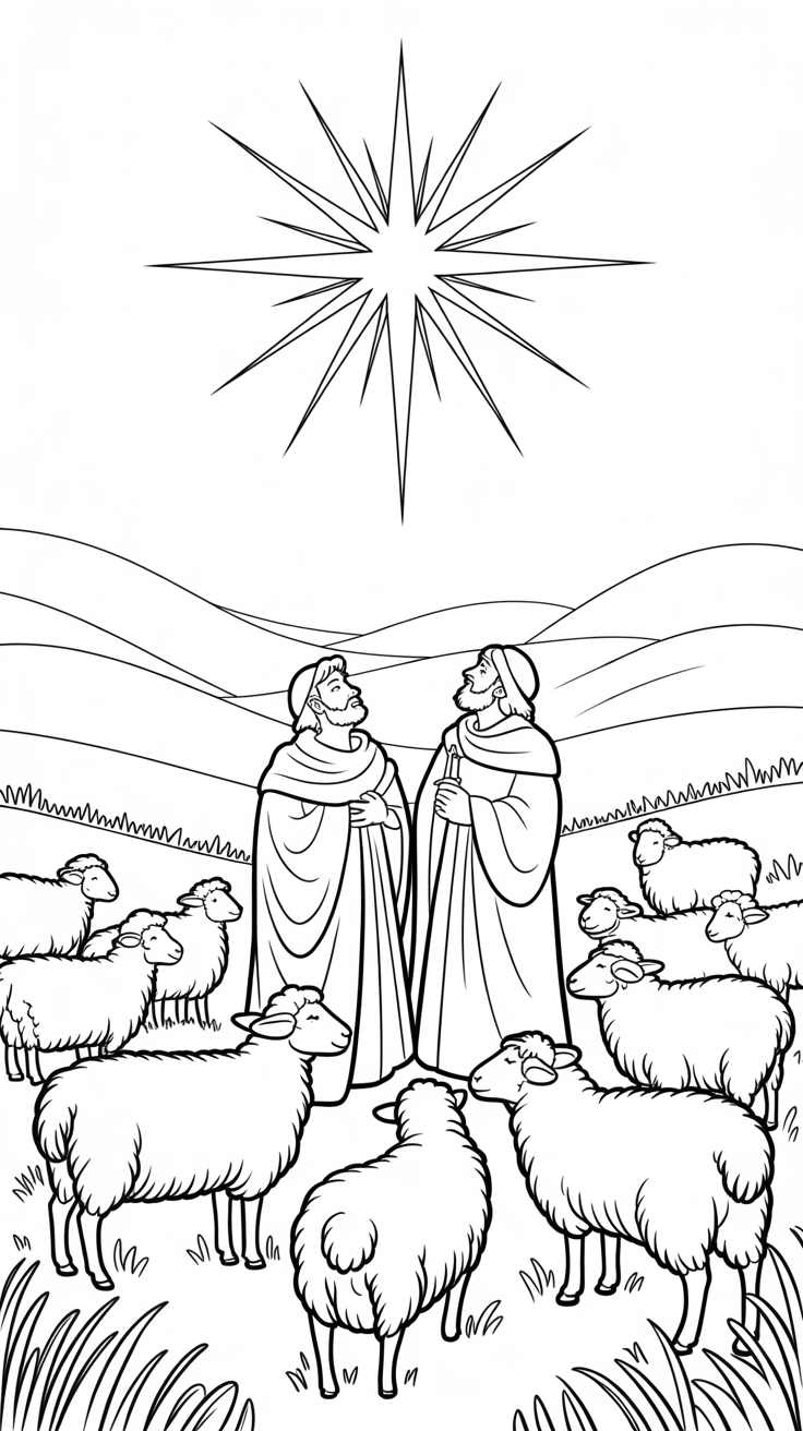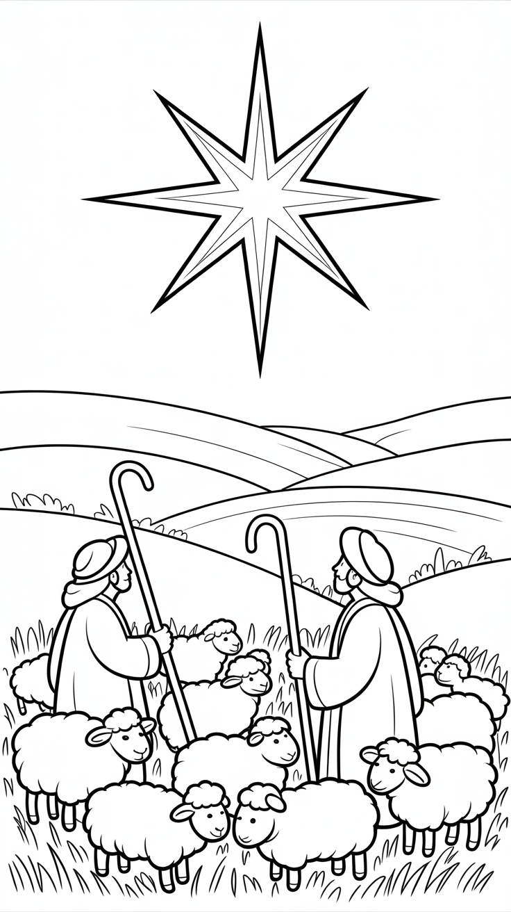 ⭐ 5. Shepherds and Star of Bethlehem Coloring Page