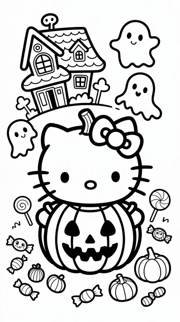 Spooky meets cute! These coloring pages show Hello Kitty dressed as a witch, vampire, or pumpkin, surrounded by candy and ghosts.