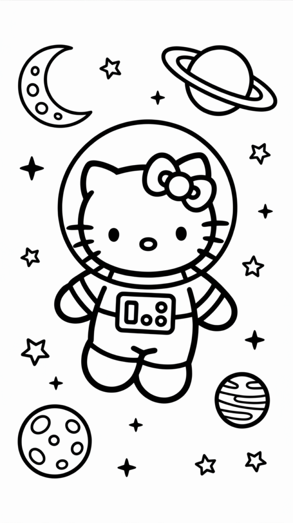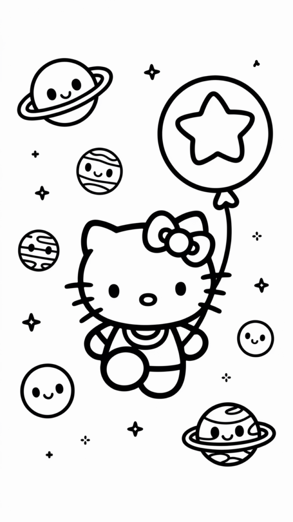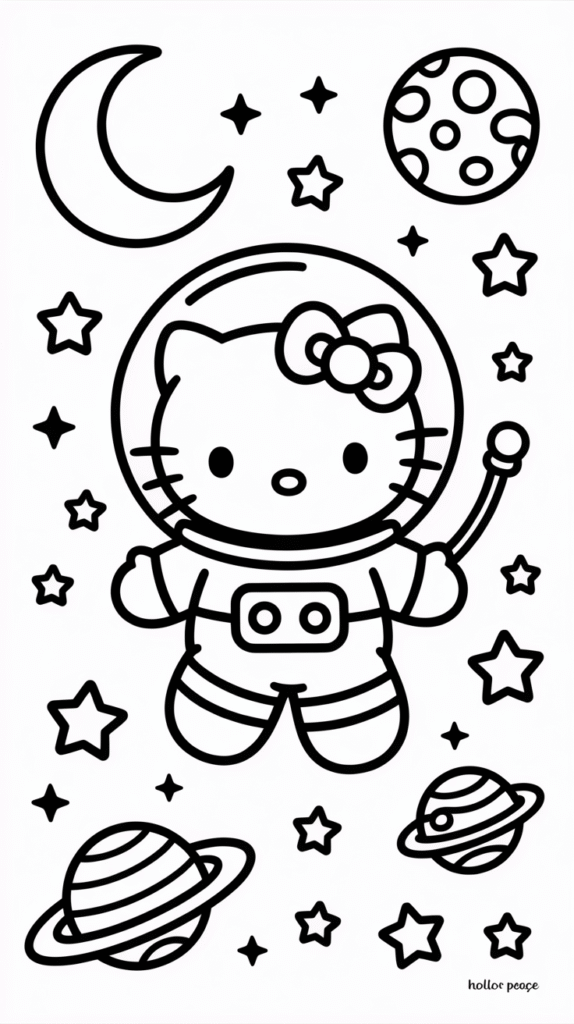 : Galaxy Hello Kitty, space coloring pages, aesthetic kawaii art