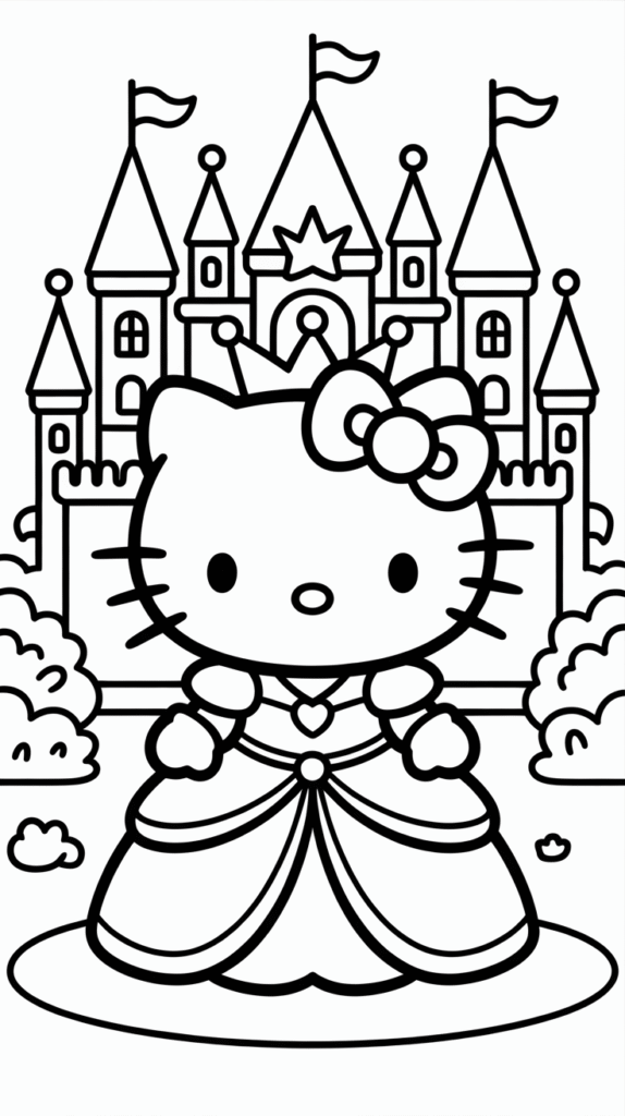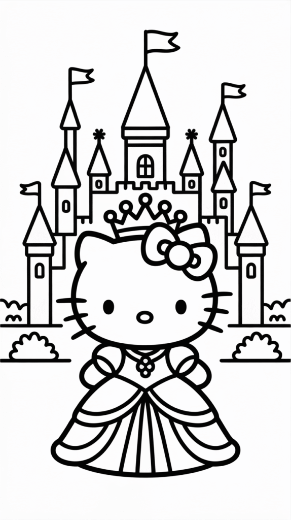 Turn Hello Kitty into royalty! These pages feature crowns, gowns, castles, and dreamy backgrounds.