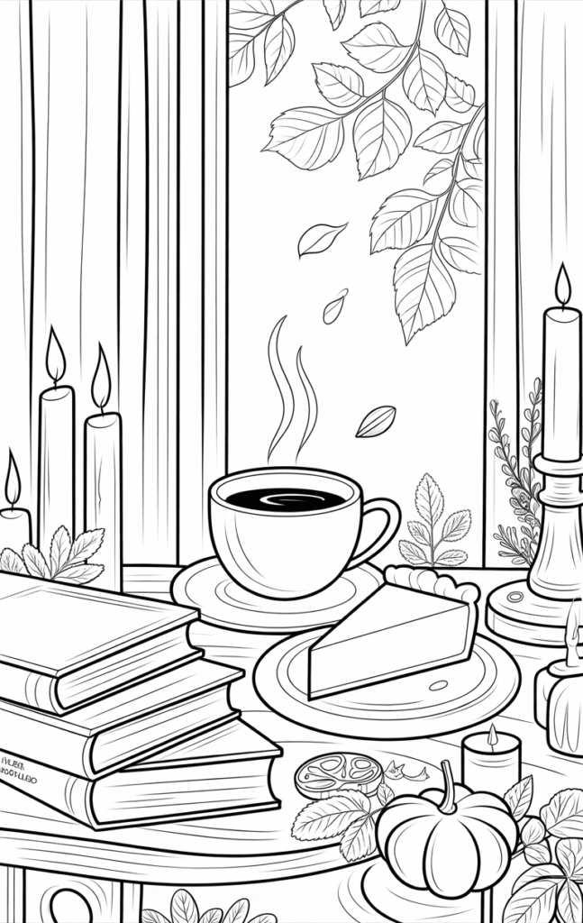 • Coloring pages with mugs of hot chocolate, cozy blankets, candles, and fireplaces are perfect for relaxing nights in.