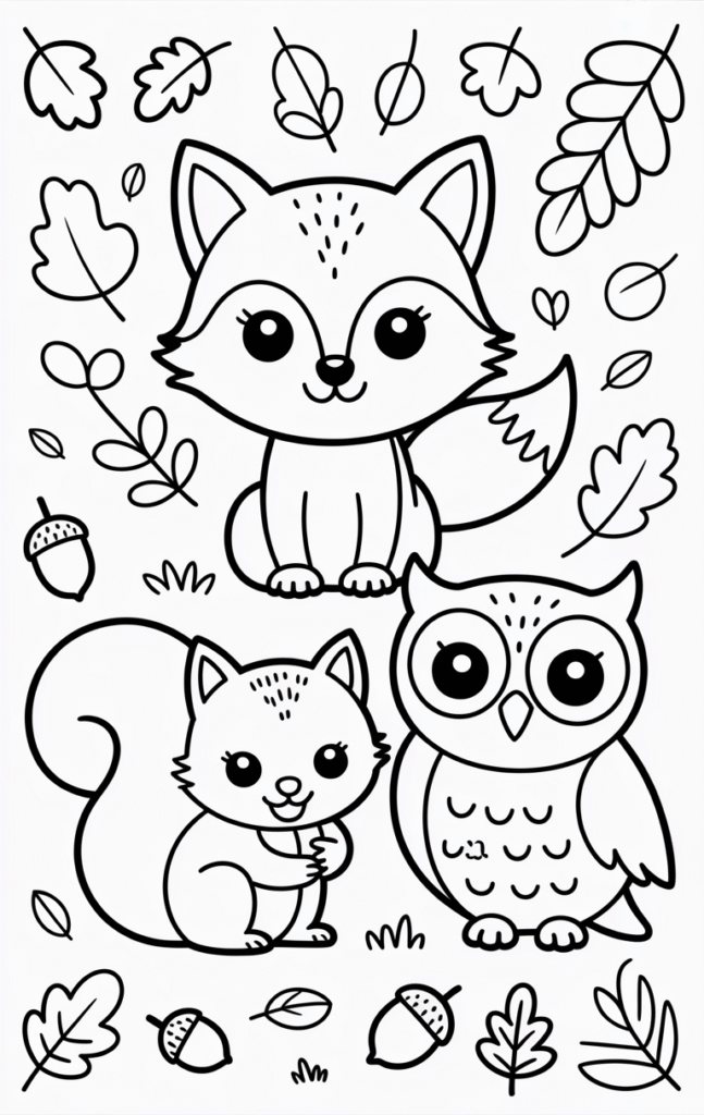 • Cute squirrels, foxes, deer, and owls surrounded by leaves are top picks. Searches for “cute fall animals coloring page” have doubled this season.