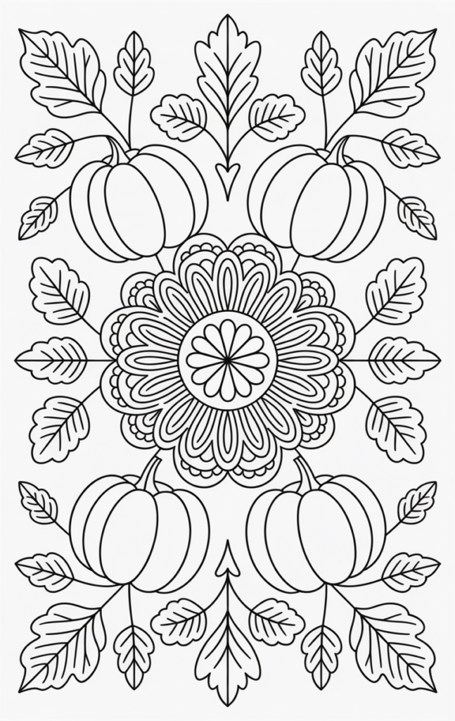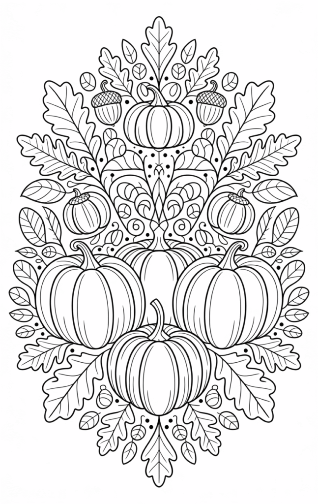 • Detailed mandalas featuring leaves, pumpkins, and acorns.